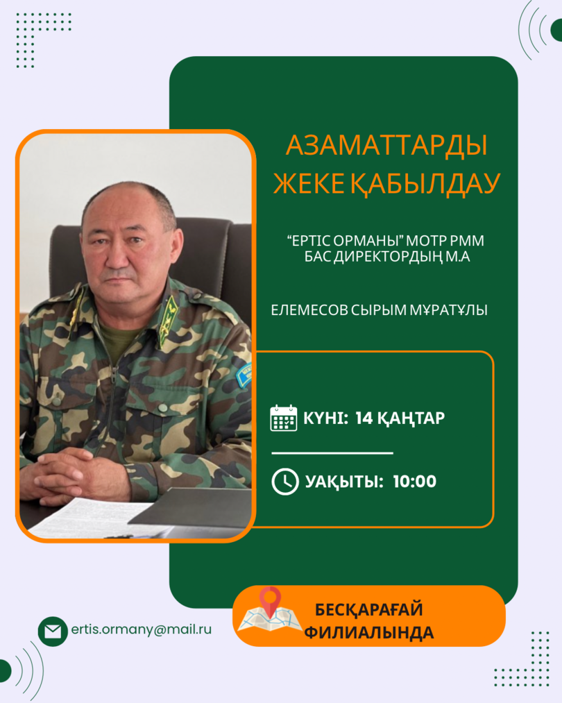 Исполняющий обязанности генерального директора ГЛПР «Ертіс орманы» Елемесов Сырым Муратович проводит приём граждан по личным вопросам.